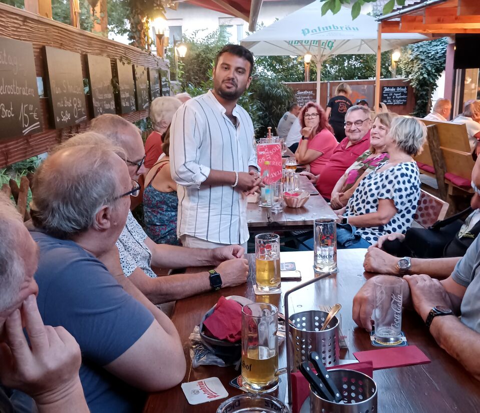 Zur ersten Aktion dieses Formates lud man dann in den Biergarten des Badischen Hofes in Sulzfeld ein. Optimales Wetter und der Biergarten boten eine wunderbare Gelegenheit, in entspannter und angenehmer Atmosphäre zusammenzukommen, sich kennenzulernen und in einem offenen Dialog Erfahrungen auszutauschen. Überrascht waren die Organisatoren, dass Rolf Becker und Markus Müßig tatsächlich über 20 Gäste begrüßen konnten, darunter auch welche aus den Ortsvereinen Kraichtal, Sternenfels und Bretten.